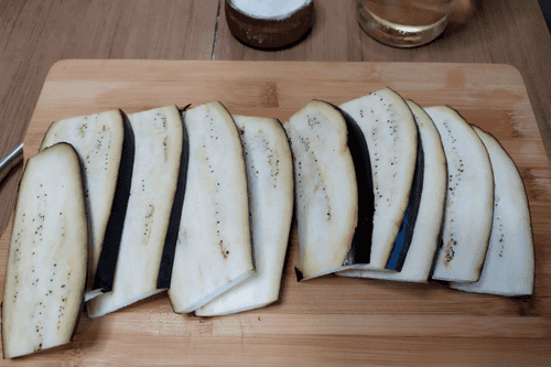 Баклажаны нарезать вдоль на ломтики толщиной около 0,5 см.