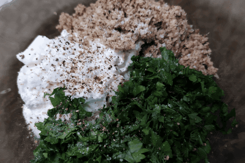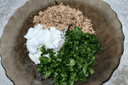 Соединить измельченные орехи, творожный сыр и мелконарезанную зелень.