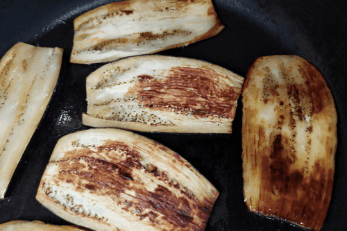 Баклажаны обжарить с двух сторон на растительном масле до золотистого цвета.