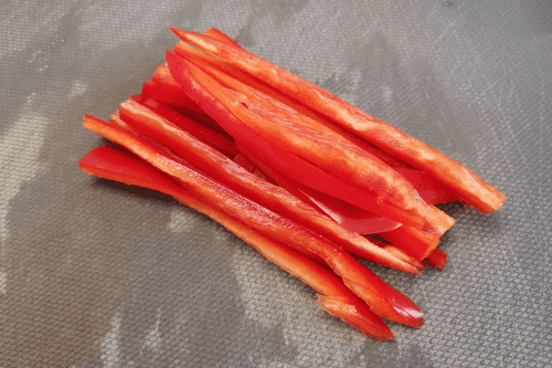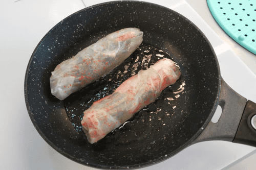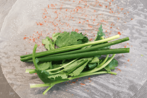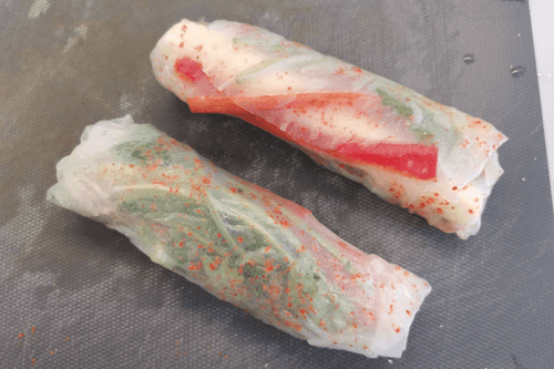 Лист рисовой бумаги замочить в прохладной воде на несколько секунд. Затем переложить его на ровную поверхность, посолить и приправить паприкой.