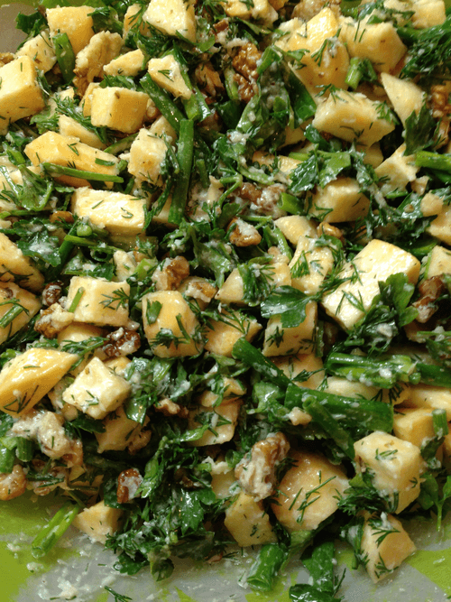 Основа салата - порезать репу, зелень, потом смешать с маслом и орехами.