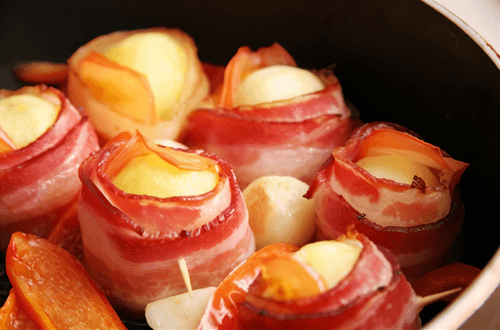 Порежьте каждый ломтик бекона на 4 полоски и обмотайте их вокруг каждой половинки картофеля. Наденьте на каждую шпажку по 4 куска. Сверху смажьте оливковым маслом и жарьте 3-4 минуты с двух сторон или до золотистой корочки.