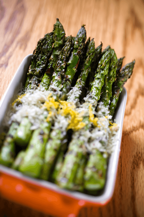 В кастрюле доведите воду до кипения, выложите спаржу и варите 2-3 минуты или до мягкости. Хорошо просушите и выложите на теплые тарелки. Сбрызните оливковым маслом и посыпьте гремолатой. Подавайте немедленно.