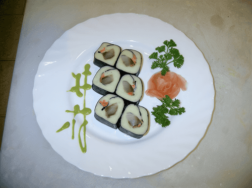 Нарезать очень острым ножом, смачивая его в воде. Уложить на сервировочное блюдо, подавать с васаби или горчицей.