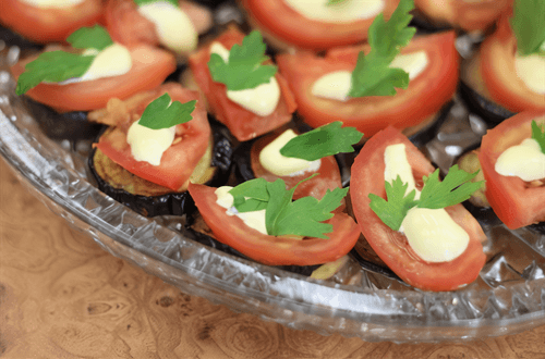 На 4 сервировочные тарелки выложите листья руколы, затем баклажаны, а сверху — помидоры и кусочки боккончини.