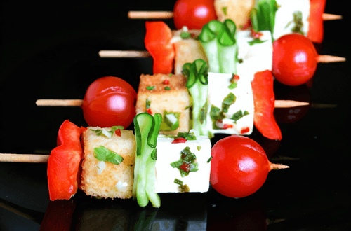 Берем длинные шпажки или деревянные шампуры для шашлычков. Накалываем овощи по очереди: перец, хлеб (предварительно обмакнув в маринаде), цукини складываем гармошкой и накалываем, кубик моцареллы, осторожно вытащив его из маринада и завершаем помидоркой черри.