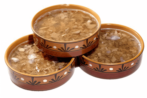 После варки отделить мясо от костей и нарезать мелкими кусками. Мясо перемешать и разложить по формам слоем 2 см. Залить формы оставшимся бульоном и добавить мелко нарезанный чеснок.