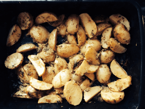 Жарьте примерно 20 минут, затем перемешайте и готовьте еще 25 минут до мягкости и золотистой корочки. Переложите на блюдо и подавайте.