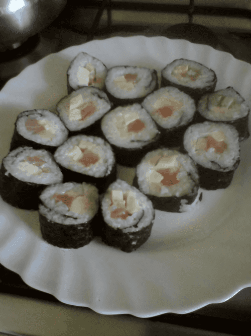 На лист нори выложить тонкий слой риса, с одной стороны положить начинку: рыбу и огурец, сыр и авокадо, или рыбау и перец, зеленый лук и сыр, или шпроты и зеленый лук, укроп и огурец, или же креветки и зеленый лук, огурец и сыр. Комбинировать можно все подряд. Закатать в рулет при помощи специальной бамбуковой салфетки.