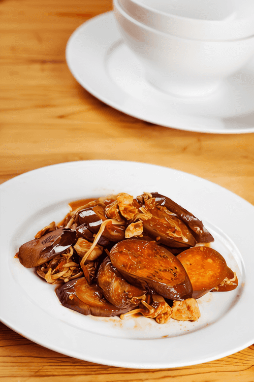 Жареные баклажаны в соевом соусе и мирине с чесноком
