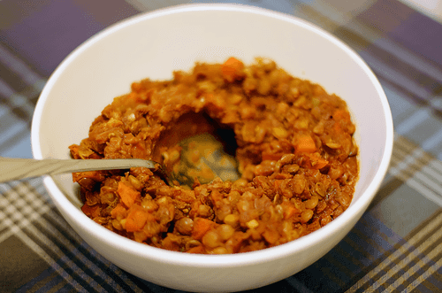 В сковороду добавьте томаты, чечевицу, карри, бульон, тмин, соль и перец. Доведите до кипения, уменьшите огонь, накройте крышкой и тушите примерно 40 минут, пока чечевица не станет мягкой. Снимите с огня и оставьте в закрытом виде на 10 минут. Добавьте уксус и посолите. Подавайте горячим.