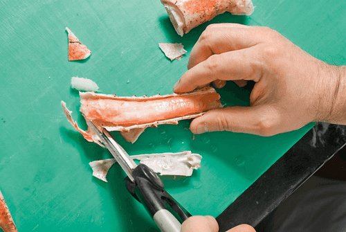 Фаланги камчатского краба разморозить. Разрезать панцирь — для этого не нужен специальный секатор, подойдут и обычные ножницы. Извлечь мясо руками и оставить минут на десять, чтобы стекла лишняя вода. Если вы имеете дело с уже очищенным крабом, его тоже надо разморозить и избавить от излишков влаги.