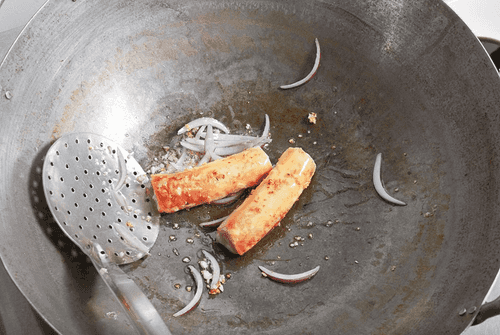 Мелко нарубить чеснок, нарезать лук тонкими дольками. Влить в вок пару ложек масла и поставить сковороду на максимальный огонь. Азиатская традиция требует, чтобы к началу готовки масло задымилось. Как только появится черный дымок, бросить в вок чеснок и лук.