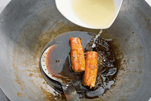 Полить краба соевым и устричным соусами, слегка перемешать. Затем влить в вок стакан горячего куриного бульона. Еще какое-то время — примерно тридцать секунд — уйдет на то, чтобы крабовое мясо успело напитаться вкусом бульона и соусов.