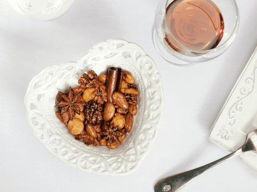 Налить в большую кастрюлю с толстым дном полтора литра воды, положить сахар, корицу, анис, крупномолотый чили, соль и довести до кипения. Добавить все орехи. Снова довести до кипения, поварить пять минут, слить сироп и дать орехам остыть в течение получаса.