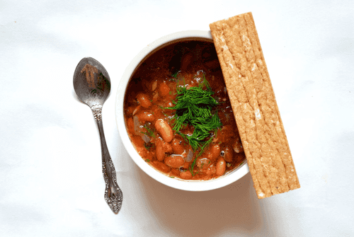 Постоянно помешивая доводим фасоль до готовности. После чего снимаем с огня и заправляем остатками рубленной свежей зелени смешанной с пюре из свежих помидоров.