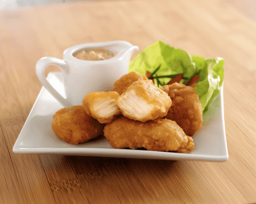 Золотистые куриные кусочки в кукурузных хлопьях с абрикосовым соусом