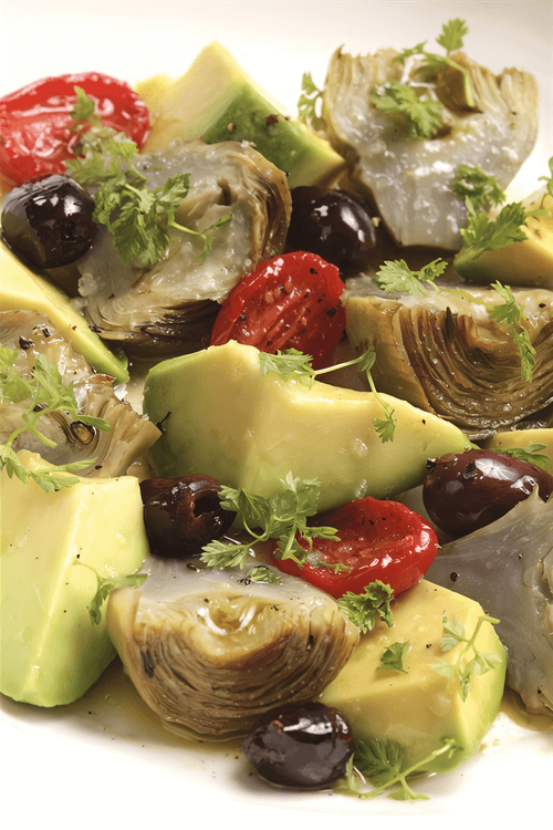 Молодые артишоки с авокадо, таджарскими оливками и томатами «Дотерно»