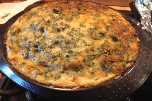 Приготовить заливку: взбить яйца, сметану, молоко и сыр, добавить чеснок (пропущенный через чеснокодавилку) и горсть мелко нарубленной зелени (петрушка, майоран, базилик, душицу).