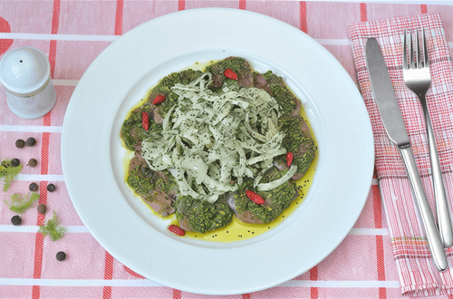 Карпаччо из маринованной телятины — изысканное блюдо итальянской кухни, вдохновлённое традициями венецианских ресторанов. Нежнейшая телятина, выдержанная в ароматном маринаде из соевого и вустерского соусов, мёда, чеснока и специй, приобретает насыщенный вкус с легкими пикантными нотками. Обжаренное мясо сохраняет сочность, а маринад наполняет его глубиной аромата. Подаётся карпаччо тонкими ломтиками, сочетающимися с освежающим салатом из фенхеля, заправленным винным уксусом и семенами горчицы. Этот лёгкий, но богатый на вкус деликатес идеально подходит как закуска или изысканное блюдо для особых случаев.