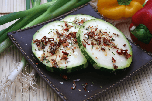 Тонко нарежьте кабачки и переложите в миску. Добавьте заправку и хорошо перемешайте.