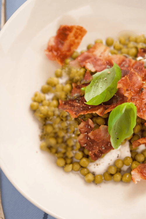 Закуска из зеленого горошка с луком и панчеттой в белом вине