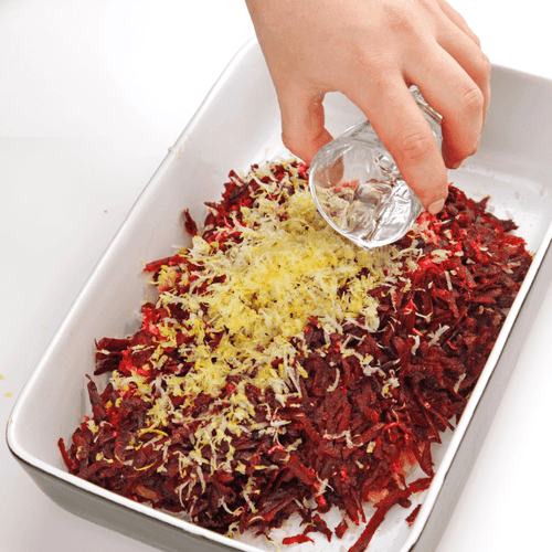 Свеклу натереть на крупной терке, на мелкой терке натереть хрен, имбирь и цедру лимона.