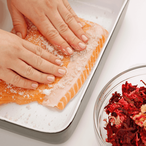 Рецепт свекольного лосося, он же гравлакс, родом из скандинавских стран. Классический вариант предполагает «захоронение» в зелени, а не свекле. Дословно гравлакс это и означает: «захороненный лосось». Готовят обычно из семги, но подойдет любая рыба из семейства лососевых — форель, кета, нерка. Древние скандинавы вылавливали рыбу, щедро ее солили и натирали пряностями, а затем просто закапывали в землю, чтобы не испортилась. И название суровое, и способ приготовления. Здесь лосось под имбирно-лимонным маринадом после засолки приобретает тонкий аромат и пряный вкус, а свекла добавляет необычный насыщенный цвет.