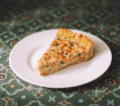 Как только сливочно-яичная поверхность как следует подрумянится, вынуть киш из духовки и слегка остудить. Нарезать на порции и подавать горячим.