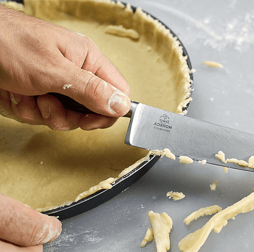Готовое тесто скатать в шар, завернуть в пленку и положить на час в холодильник. Охлажденное тесто раскатать, выложить в форму и сформировать бортики. Обрезать ножом лишнее тесто по краям.