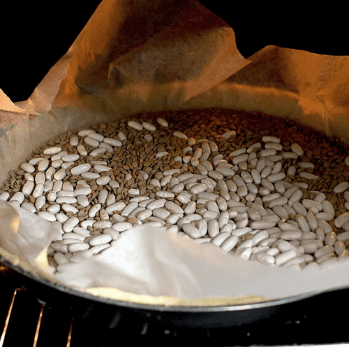 Застелить тесто пергаментом и заполнить фасолью или пекарскими бобами. Запечь в предварительно разогретой до 180 градусов духовке в течение десяти-пятнадцати минут. Вынуть из духовки, снять пергамент и оставить форму с готовой основой остывать.