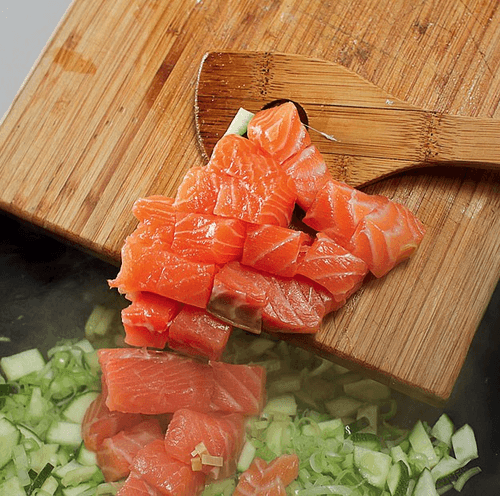 Стебель порея тонко нарезать и промыть. Цукини нарезать кубиками и потушить с пореем на слабом огне в смеси масел до готовности. Поперчить, посолить, добавить листочки тимьяна. Семгу нарезать кубиками, добавить к овощам и потушить еще четыре минуты до готовности.