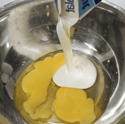 Готовую овощную смесь c семгой переложить в глубокую миску. оставшиеся два яйца взбить со сливками и добавить к овощам и рыбе. Тщательно перемешать.
