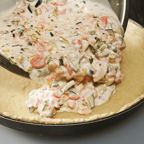 На остывшую песочную основу аккуратно выложить получившуюся рыбно-овощную смесь со сливками и яйцом, равномерно распределить ложкой.