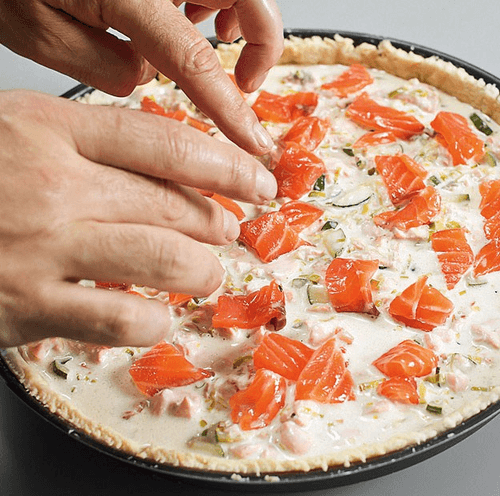 Слабосоленую семгу нарезать небольшими кусочками и выложить сверху на рыбно-овощную смесь. Поставить киш в духовку и выпекать тридцать — тридцать пять минут при 180 градусах.