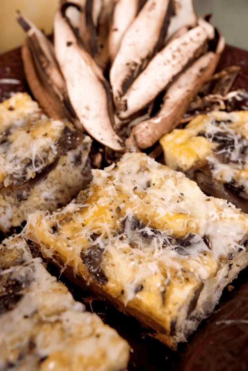 Оставшиеся грибы смешайте в огнеупорной форме с рикоттой, сметаной, майонезом, натертой моцареллой, пармезаном и грибным пюре. Хорошо перемешайте и запекайте 20-40 минут до румяной корочки.