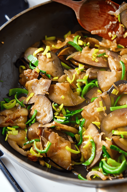 Баклажаны с грибами и беконом по-китайски — это ароматное и насыщенное блюдо, которое вобрало в себя традиционные вкусы китайской кухни. В нем сочетаются нежность баклажанов, глубокий вкус сушеных грибов шиитаке и пикантный оттенок бекона, дополненный соевым соусом и кунжутным маслом. Вкусовая палитра этого блюда многогранна: легкая сладость баклажанов переплетается с умами грибов и солоноватостью бекона. Готовится оно в воке, который позволяет сохранить яркость ингредиентов и придать им аппетитную текстуру. Подается горячим, украшенным свежим зеленым луком, отлично сочетается с рисом или лапшой. Это блюдо можно встретить как в домашних трапезах, так и в ресторанах, где оно ценится за насыщенный вкус и сытность.