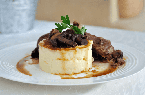Картофельное пюре с голубым сыром и соусом из грибов с карамелизованным луком