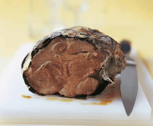 Разогреть духовку до 180 градусов, мясо поместить в рукав для запекания, обязательно оставив в нем небольшое отверстие (если этого не сделать, рукав может лопнуть, и мясо получится сухим). Оставить в духовке примерно на 3–3,5 часа.