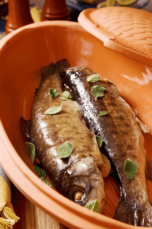 Выложите целую рыбу в форму для рыбы или просто в глубокую форму.