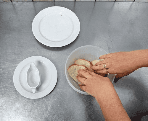 Отрезать от батона — можно обычного нарезного — три среднего размера ломтика. Корки срезать не надо. Положить их в миску и залить питьевой водой так, чтобы она полностью покрывала хлеб. Замочить хлеб можно и в молоке, но это уже будет некошерно.