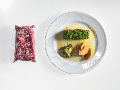 Нарезать на небольшие куски свинину и сало, прокрутить их в мясорубке вместе с фисташками. Добавить в фарш трюфельное масло, соль, по щепотке белого перца и смеси пяти специй и щепотку поменьше — молотого мускатного ореха. Перемешать фарш, завакуумировать его в форме прямоугольного брикетика.