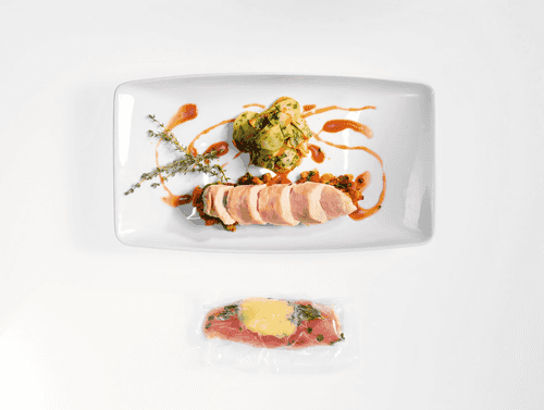 Курицу слегка посолить и поперчить и завакуумировать вместе с парой веточек тимьяна и куском сливочного масла весом около 20 г. Довести воду до температуры 64 градуса и продержать в ней пакет с курицей час.