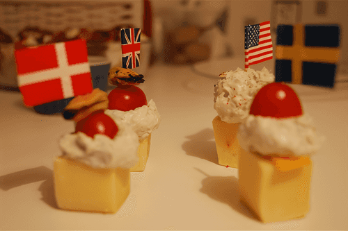 На кубики эдама положить шарики сырной смеси, сверху черри и мидии.