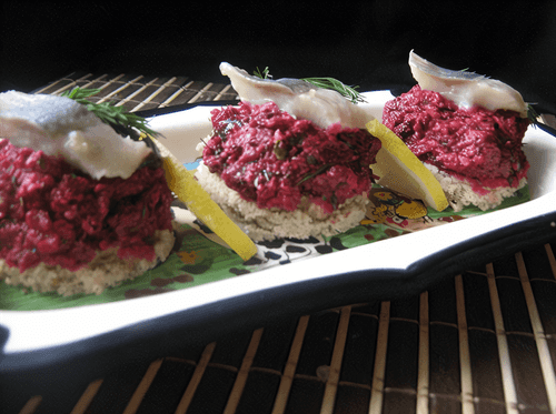 Закуска с сельдью, свекольным песто и грецкими орехами
