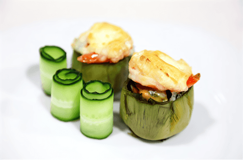Артишоки фаршированные мидиями и креветками, под шапкой из козьего сыра