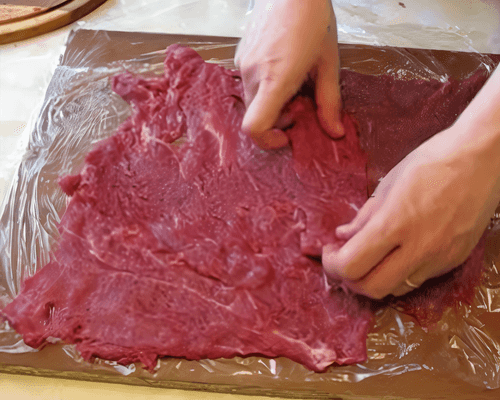 Филе порезать вкруговую одним пластом толщиной 1,5 см и хорошо отбить с двух сторон (лучше через пленку — защита от брызг) до толщины 1 см.