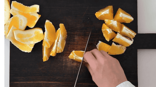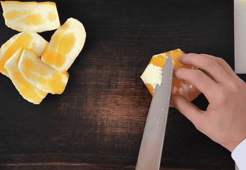 Апельсины грубо очистить ножом от цедры и толстого белого слоя под ней, который называется альбедо.