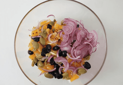 Добавить лук в миску к остальным ингредиентами Добавить каперсы.