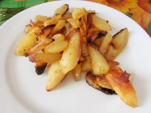 Перемешайте картофель с оливковым маслом, солью и перцем. Выложите на противень и запекайте, помешивая, до мягкости, чуть больше 1 часа.
